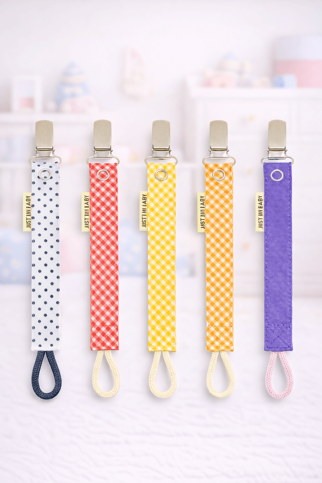 - Yumuşak dokulu kumaştan üretilen emzik askıları, bebeğin giysilerine kolayca tutturulabilen metal klips yapısı sayesinde emziğin yere düşmesini önlemeye yardımcı olur.